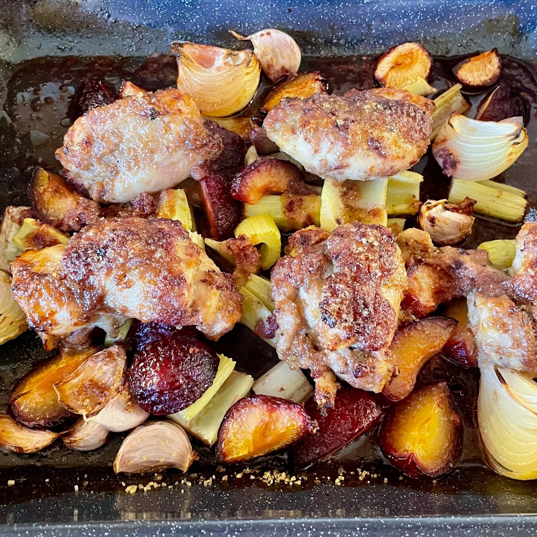 Honey & Co's chicken, plum and sweet spice traybake recipe (deliciousmagazine.co.uk)